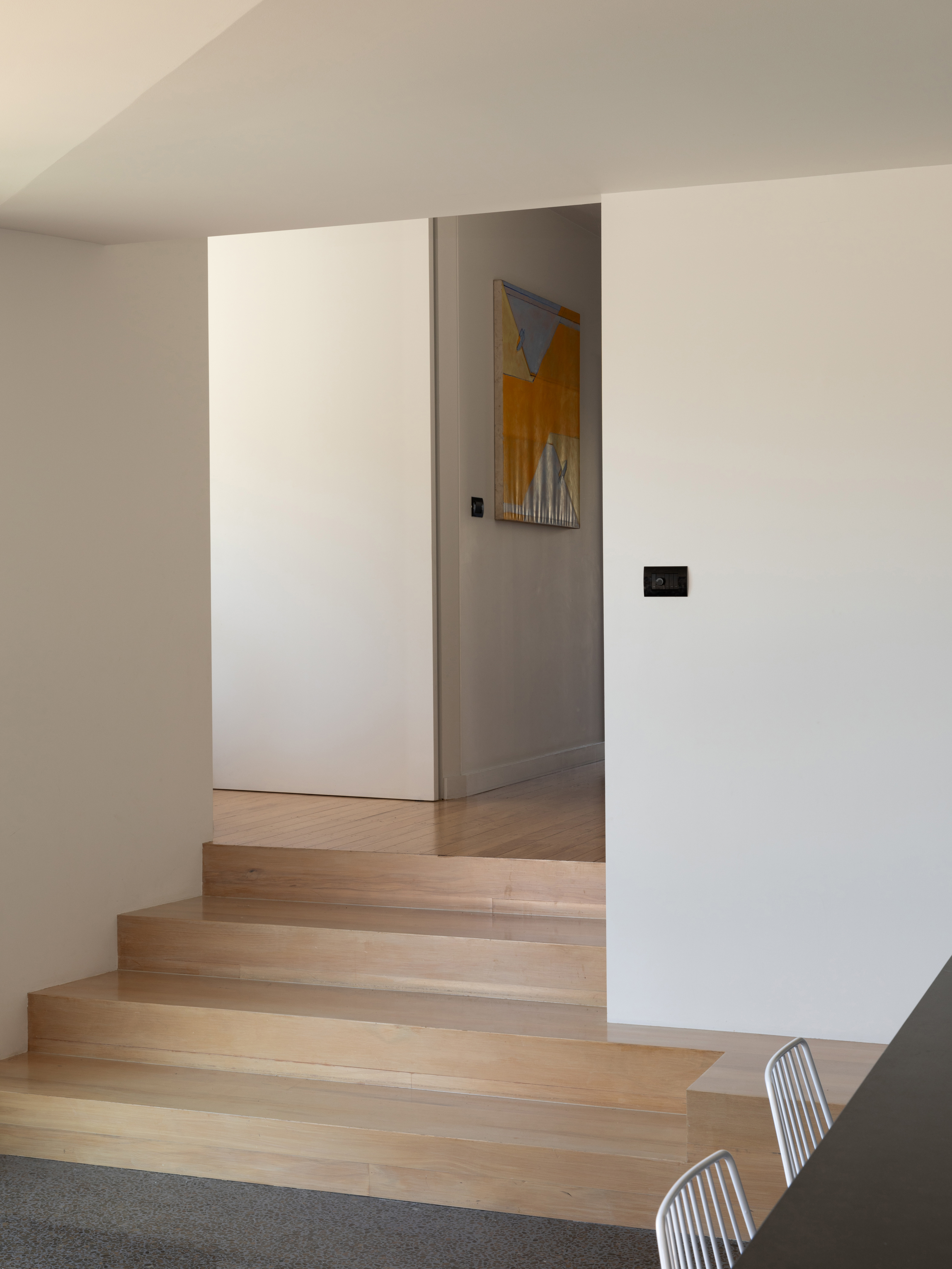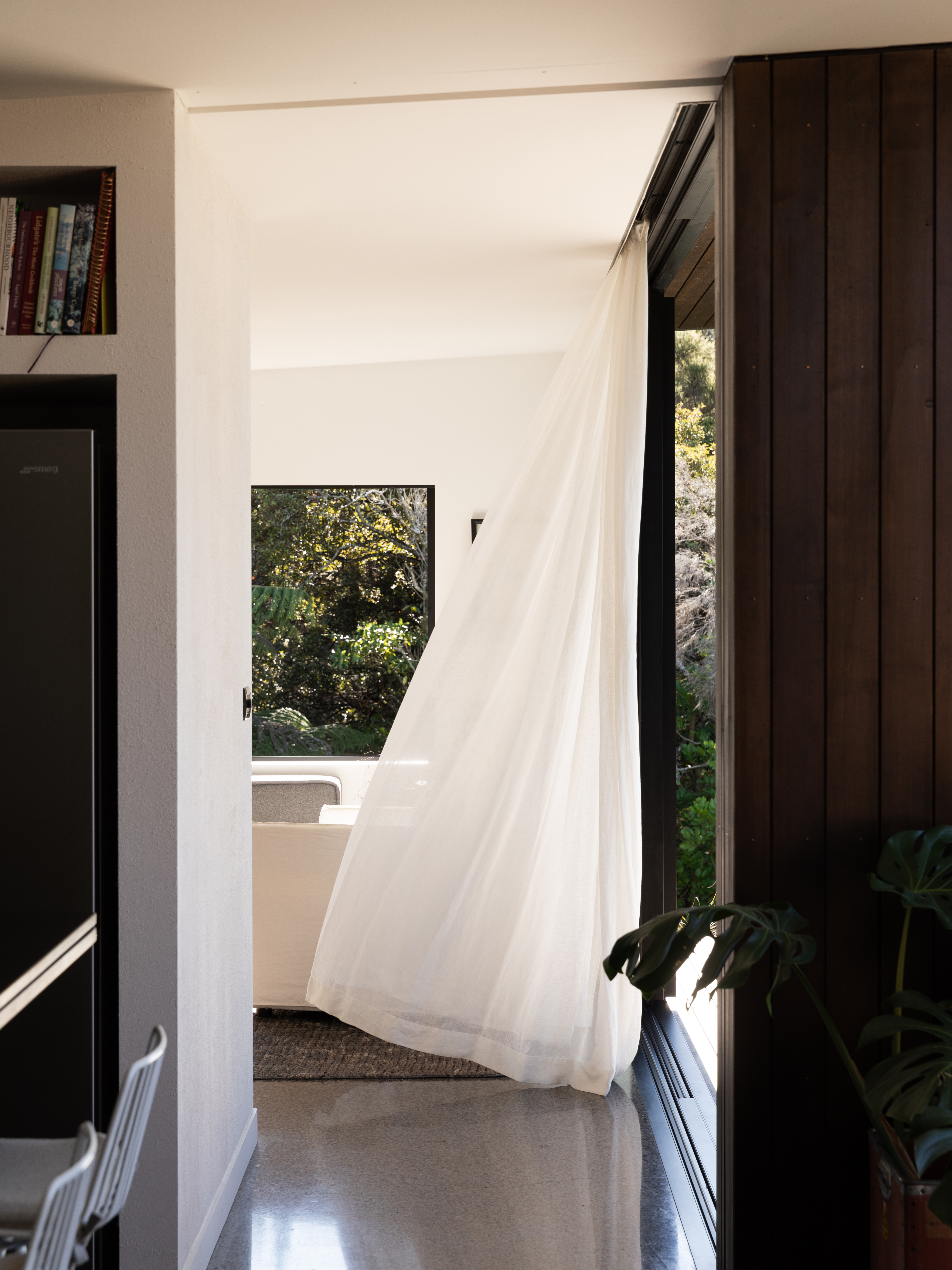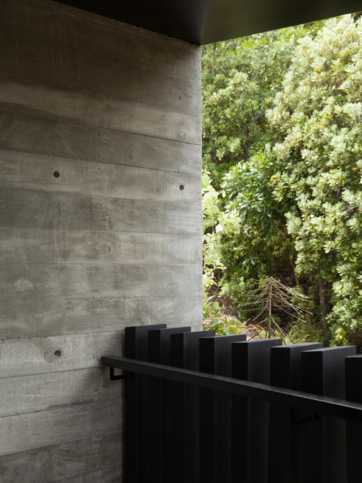 "A mid-century brick-and-tile, sitting amid pōhutukawa on a west-facing site above a beautiful bay, this house had long lost the ability to honour its surroundings. Lloyd Hartley’s renovation has replaced the garage-focused entry with a covered arrival area, formal front door and elegant new staircase with sculpture well, while upstairs there’s a large new living area with suite of bedrooms behind. Big windows, white ceilings and walls, and kitchen cabinetry of blond wood, ensure the upper floor is filled with light. The bathrooms hold special appeal: the master bedroom en suite is spacious and features a lovely large shower cubicle with light streaming from above, while a guest powder room has deliciously dark mosaic tiling. The main room opens to a large deck out to the west, which turns the corner on the north side and runs along to the master bedroom. Inside meets outside with spectacular views framed by mature trees."