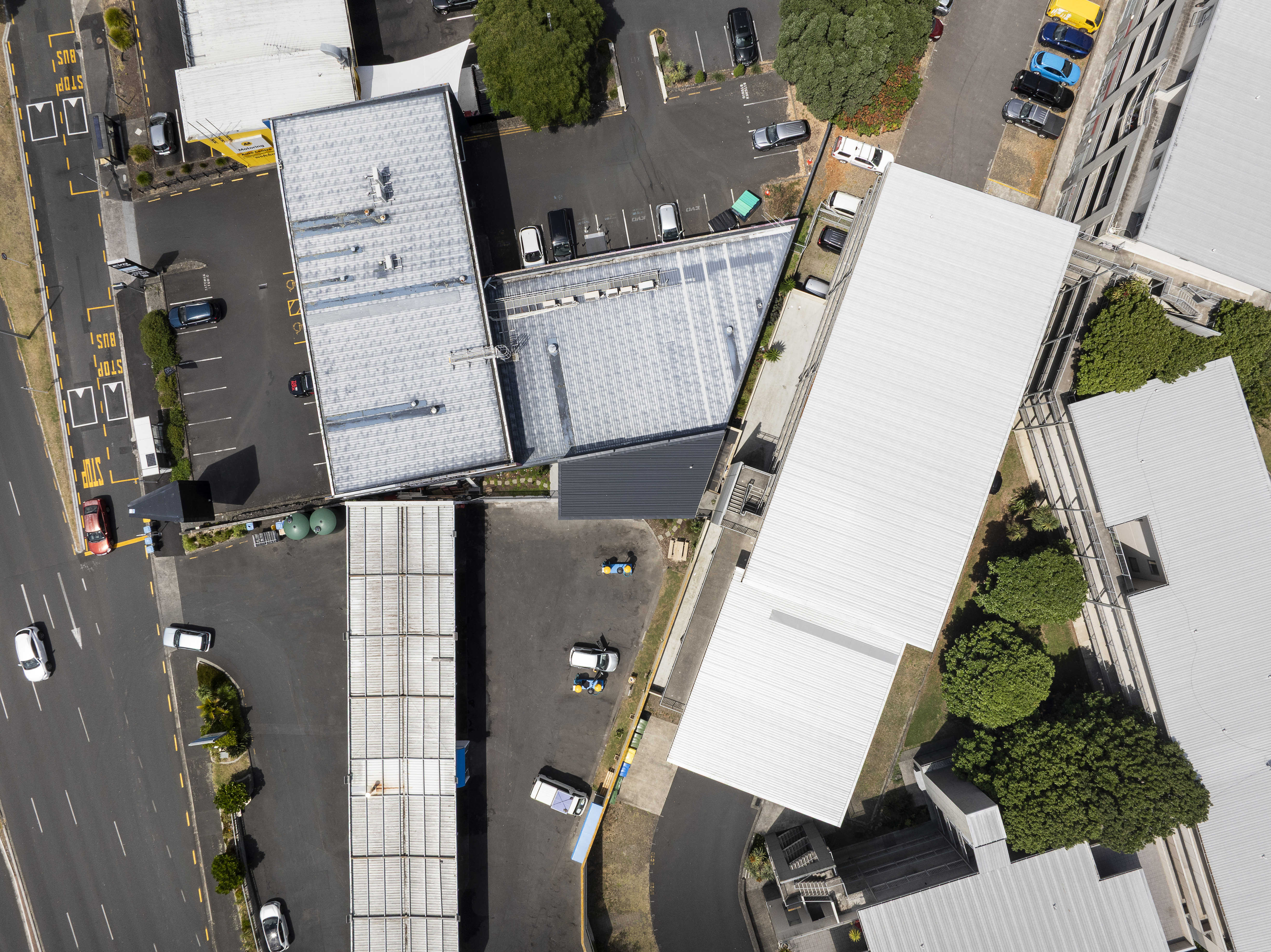 "The Washworld HQ successfully utilises a small, triangular piece of land, fitting a functional two-storey building into the southernmost corner of a busy 24/7 carwash site. With a 40m² footprint, the lower level accommodates storage and staff amenities, while the upper level provides a north-west facing office. The design makes use of durable, robust materials, including precast concrete and steel to withstand the demands of the environment. The subtle use of cedar on the upper level softens the otherwise utilitarian building, ensuring it performs well in both function and longevity."